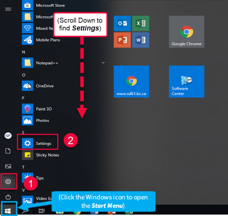 - Open the Start menu and select Settings (gear icon).