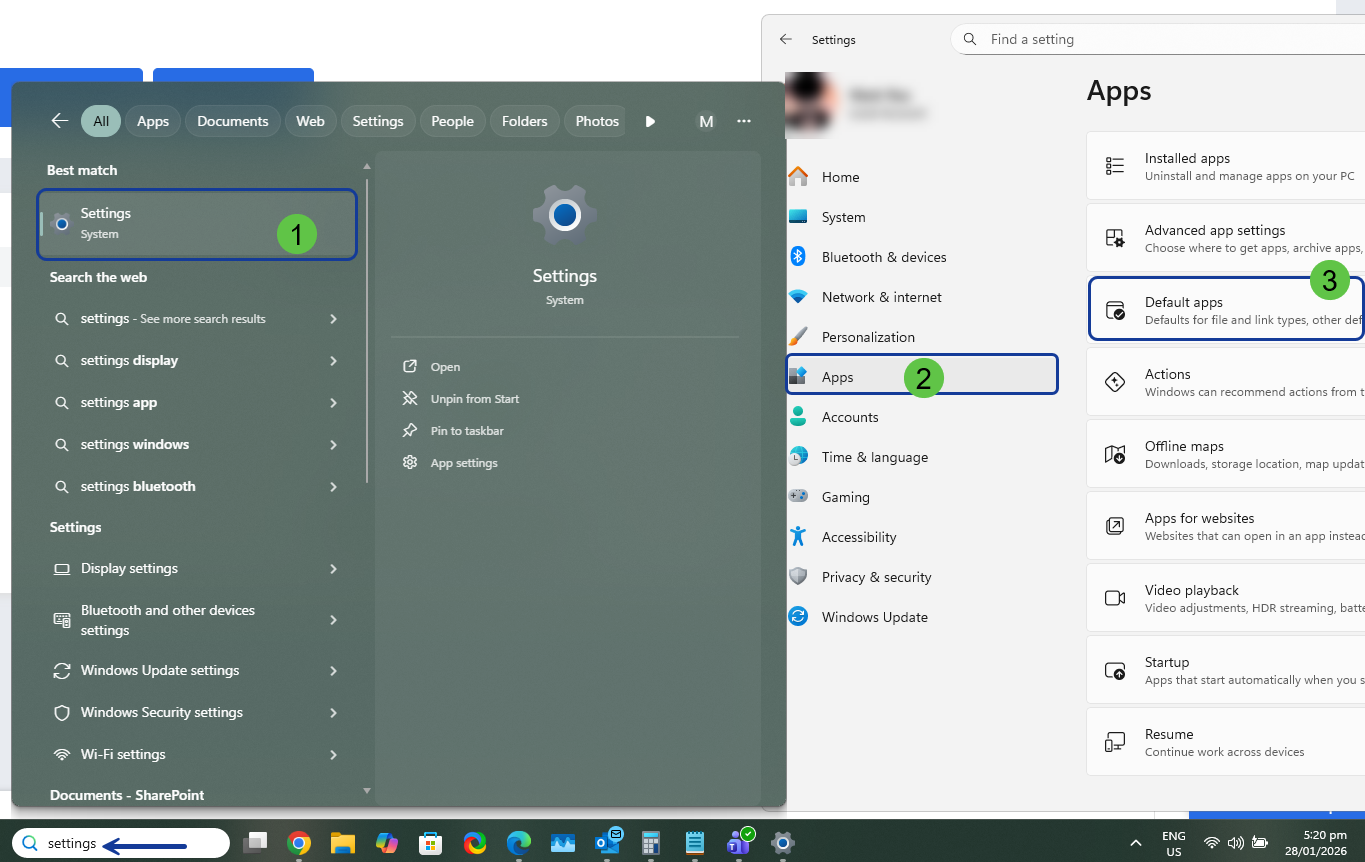 - Click Apps and select Default apps on the left pane.