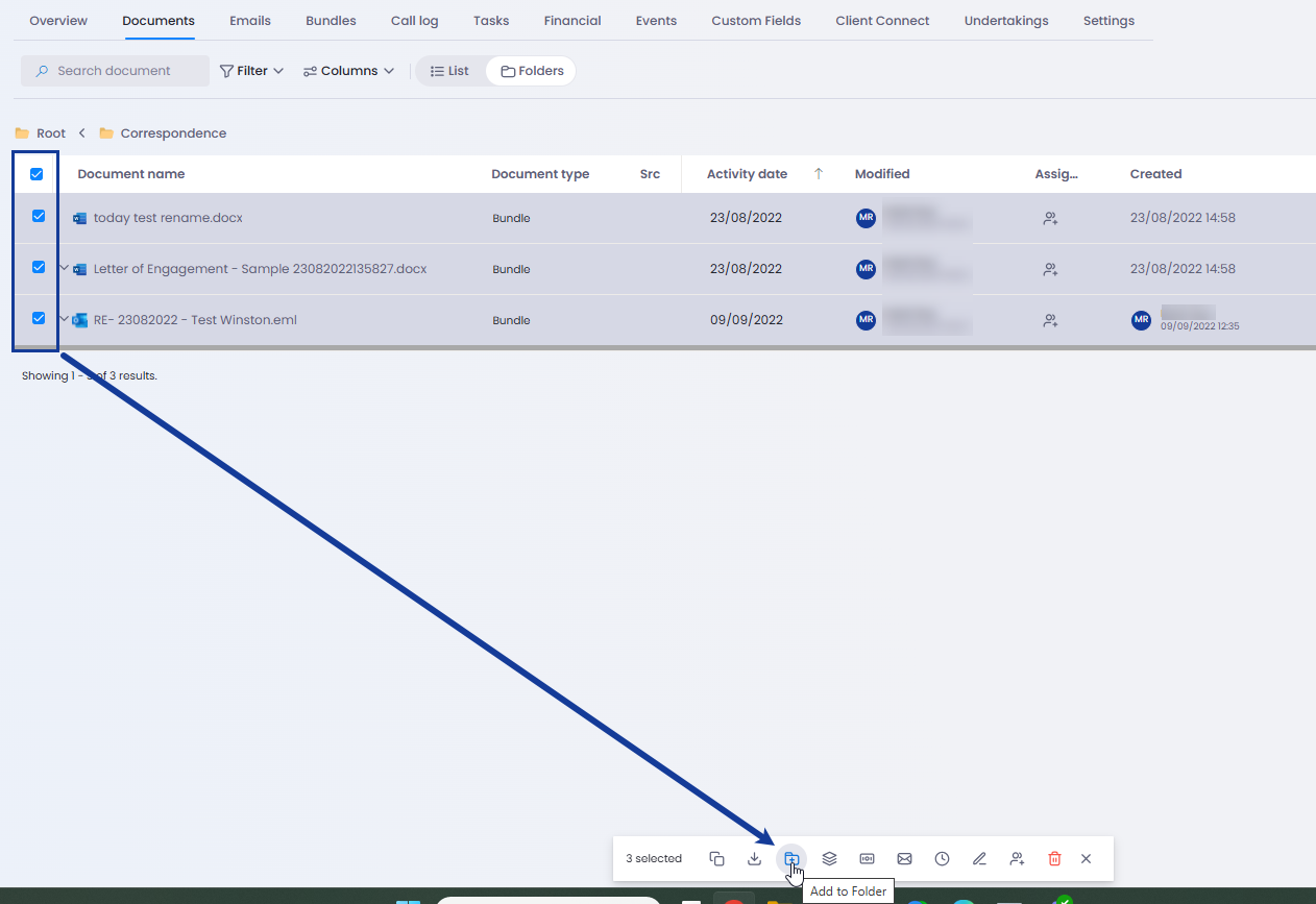Selected document/s will now be visible within that folder when viewing documents in Folders view.