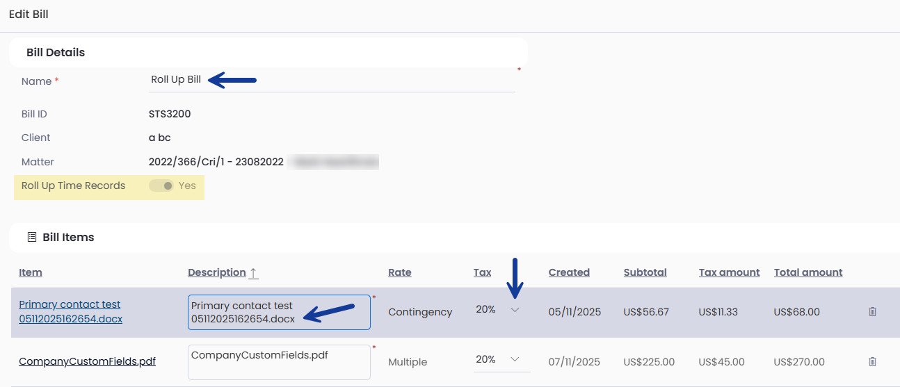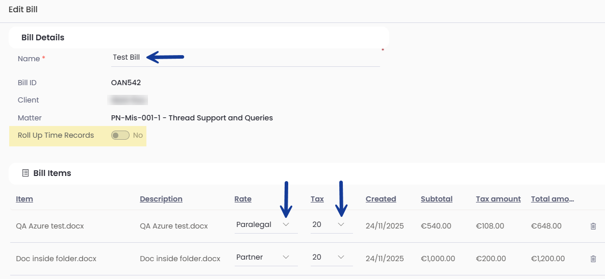 5. A pop-up window will appear where you can edit the bill details including the bill name, the hourly and tax rates for each item.