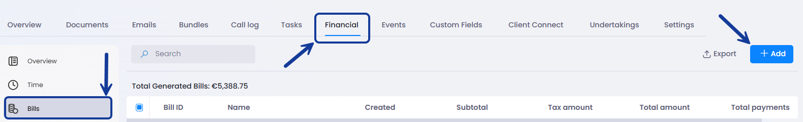 The bill will generate in the Financial / Bills tab, from where you can click on the bill name to open the bill document.