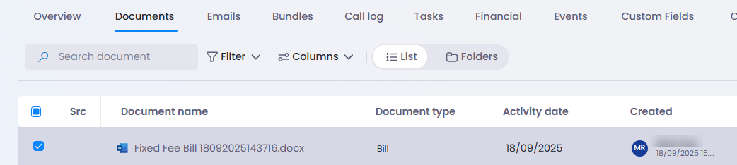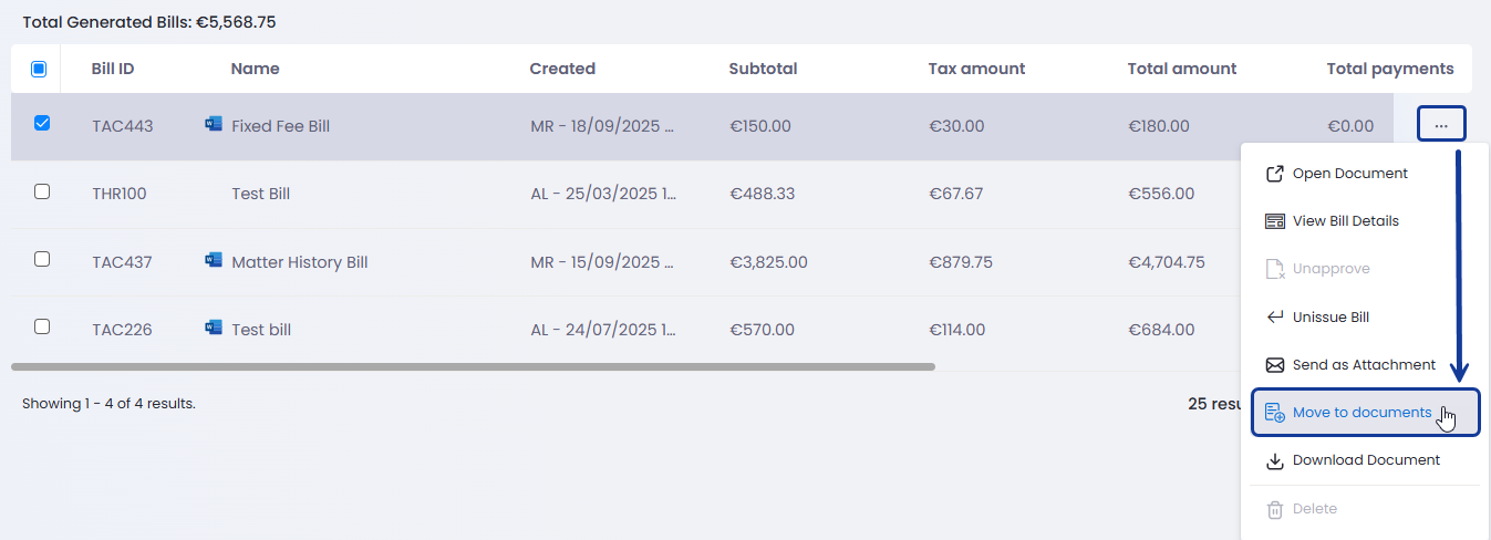 You can click the ellipsis button or do a right click to move the bill document to the Documents tab of the matter if needed. You can also download or email the bill to your client.