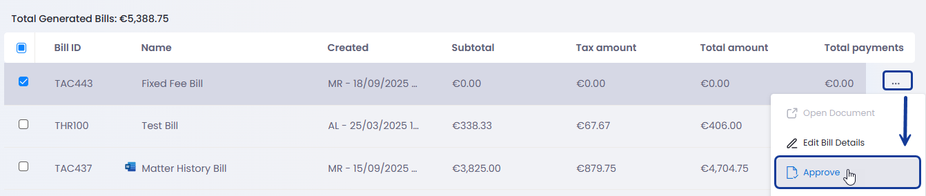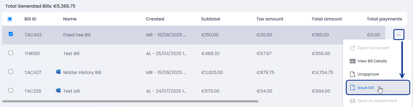 6. To issue the bill, select the bill you want to issue and click the ellipsis button or simply do a right click to Approve it (if applicable) then click Issue bill.
