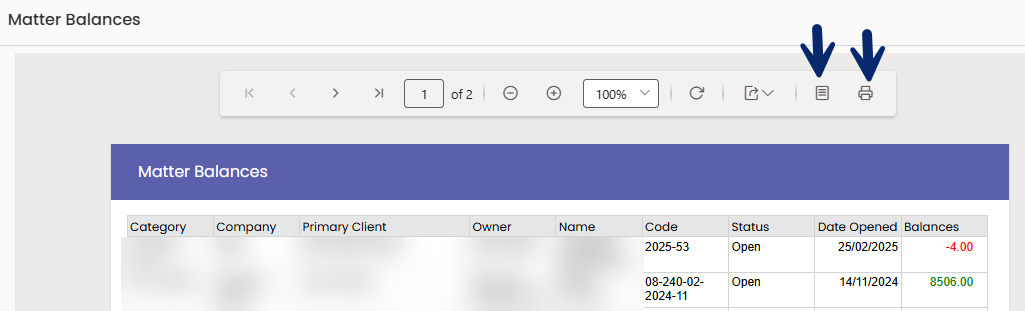 13. The Matter Balances Report will automatically generate with your selected filters in your preferred format.