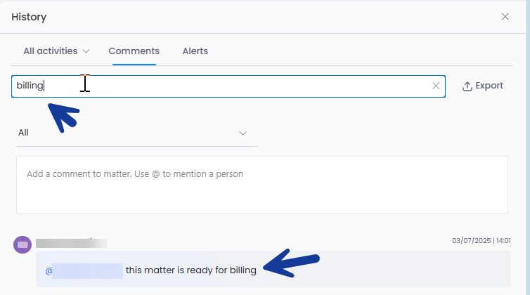Pull an Excel spreadsheet of all matter comments using the Export button.