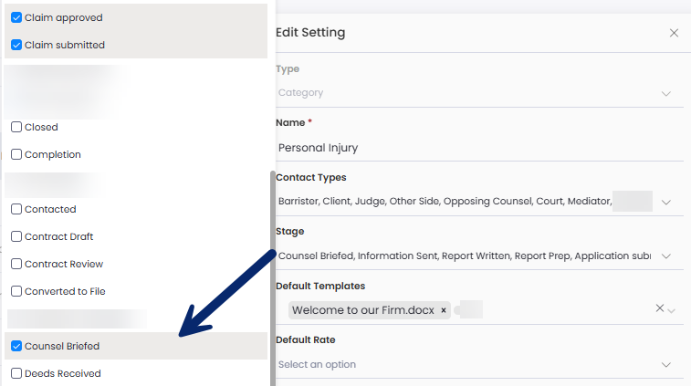 To add a new stage to a matter, the matter must be added to the matter’s category in Admin Settings.