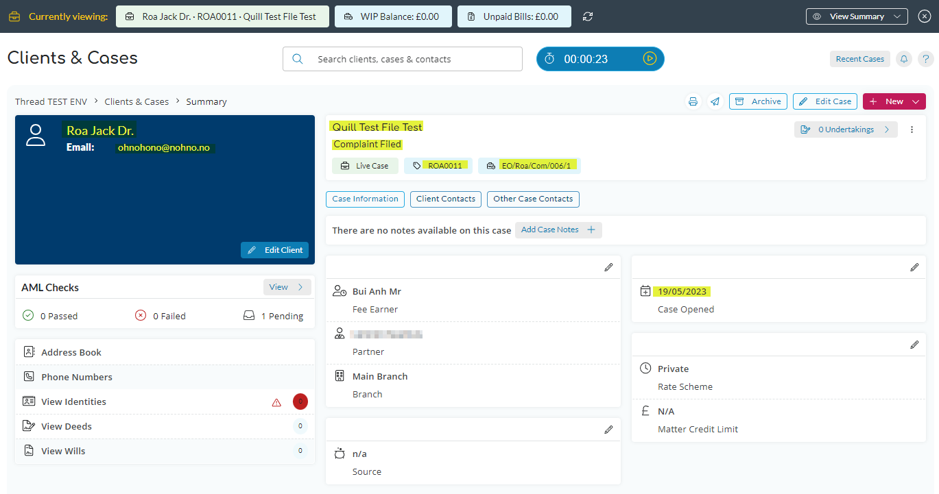 Any matter added to Thread, with main client assigned, will sync client name and email, matter name (showing as description in Quill), matter category (case type), and date opened.