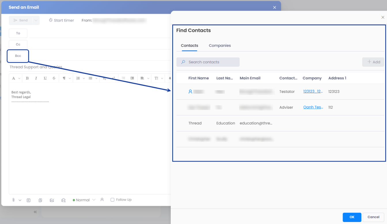 From each matter in Thread, you can send an email directly to your client or other matter contacts and have replies come back directly to the matter inbox. When sending emails from a Thread Matter you are using your Microsoft account, so any email you send or receive will also show in your Outlook.