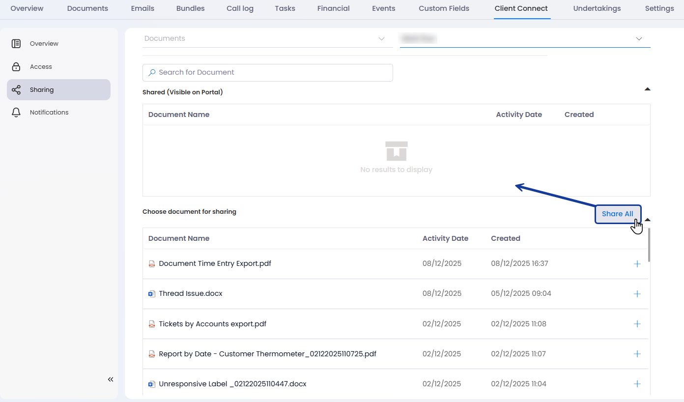 You can now select Share All option within Client Connect/Sharing tab to make it easier for you to share all documents with the client if needed quickly, without having to click on each document. You can then remove any documents you don't want to share from the top list if needed.