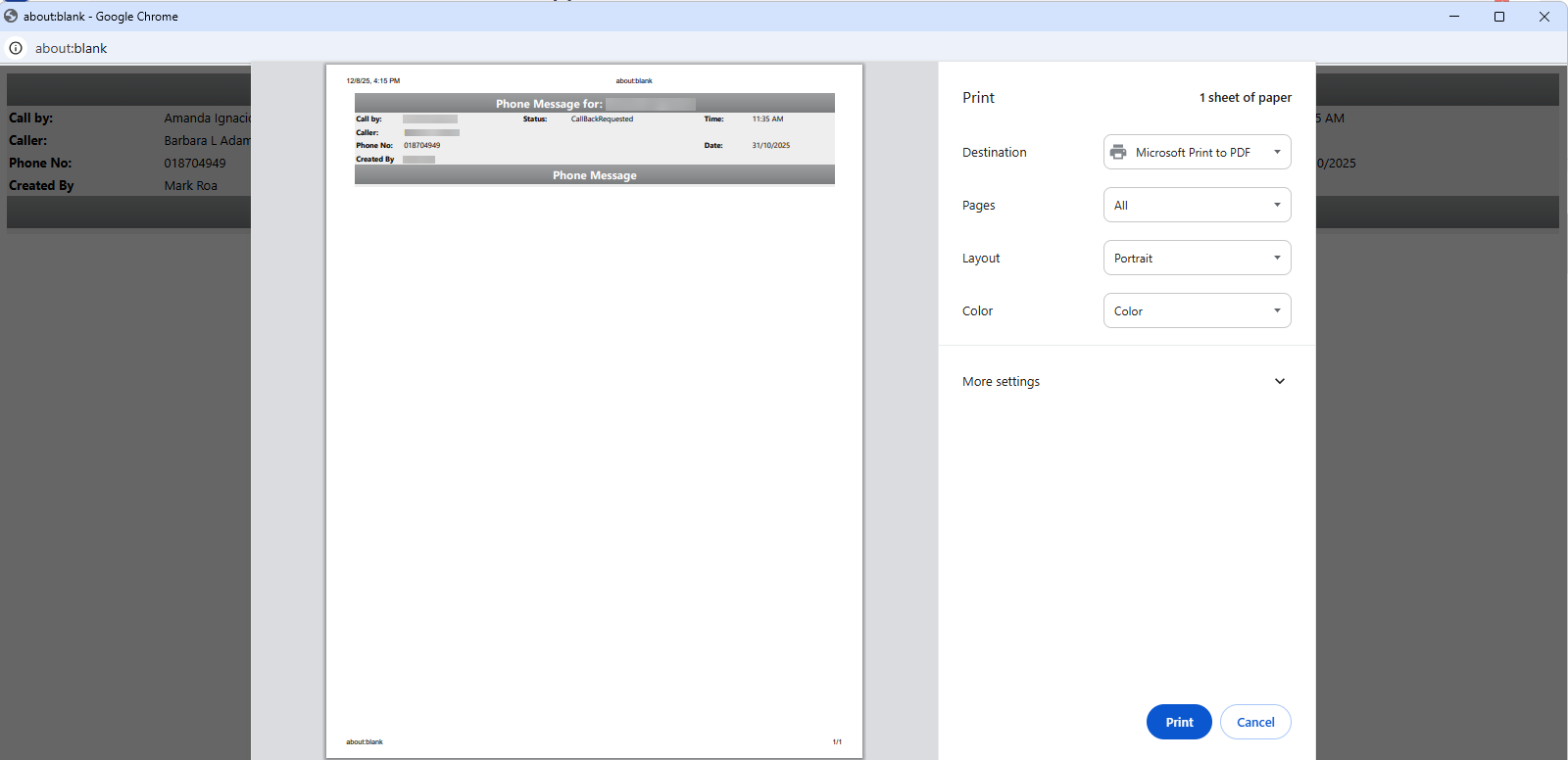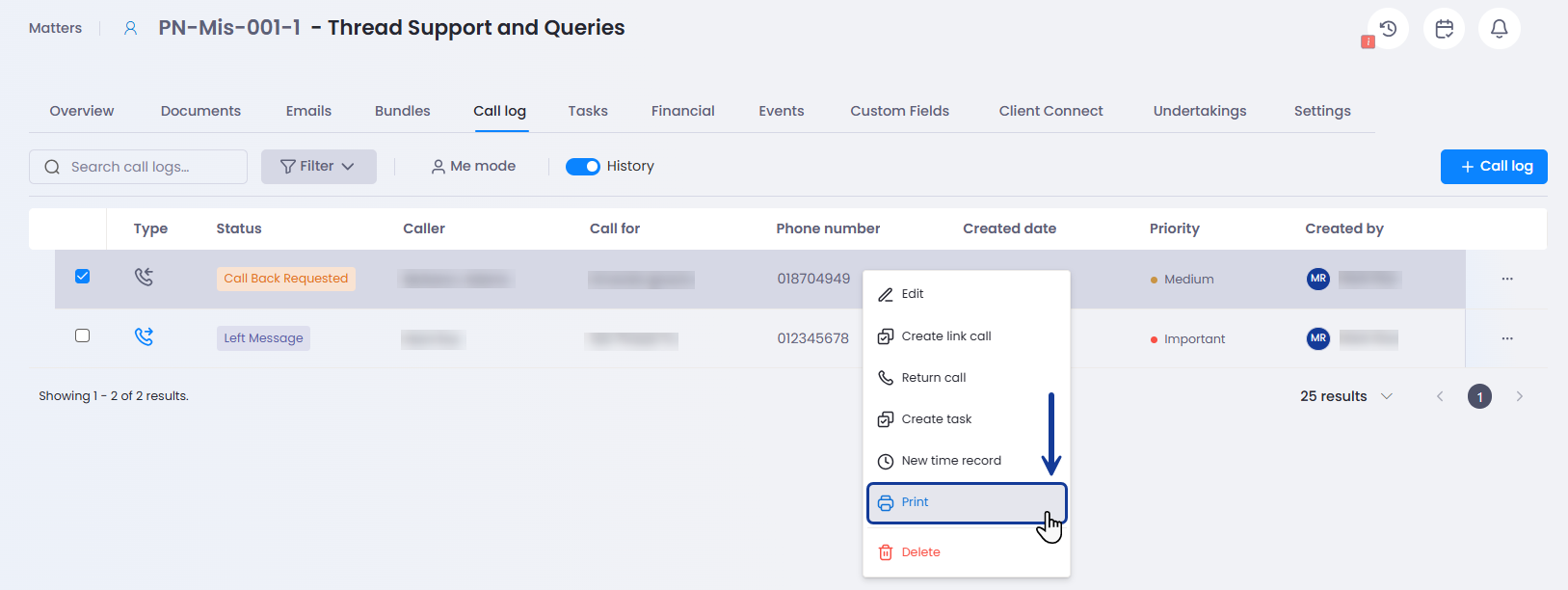 You can now print a call log from the matter directly within the Call log tab, same as from your To-do list. Just right click on a call log or click the ellipsis button to choose Print.