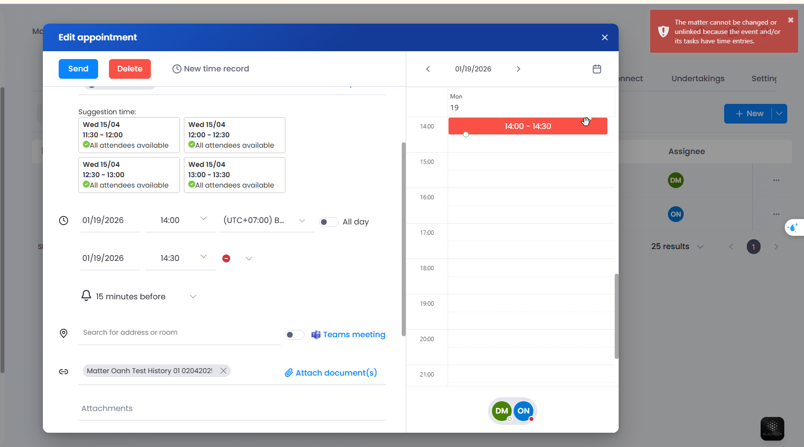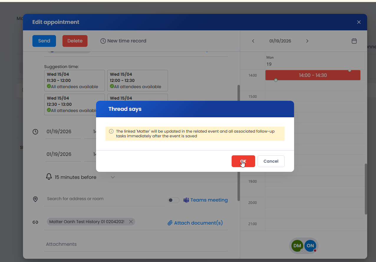 - If there are no related time logs in the event or its follow-up tasks, the Matter can be unlinked, and the event along with its follow-up tasks will be moved to the new selected Matter.