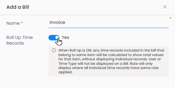 You can now select Roll Up Time Records when creating a bill, where any time records included in the bill that belong to same item will be calculated to show total values for that item, without displaying individual records.