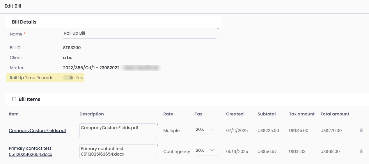 - Bill Roll up calculate values - When you create a bill with Roll Up enabled, any time records added to that Bill that belong to same item, will only add to the total values for that item (time, cost).