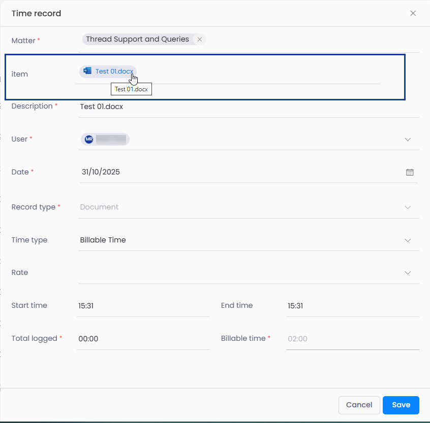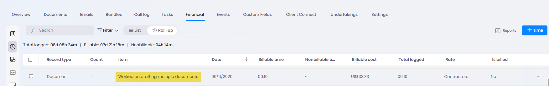 - Each time record that is linked to a specific item, such as an email, document, call log etc. will now show the item within the time record, and you can click on it to preview or open the item. You can also view the Item column on the page either in List or Roll-up view.