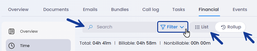- Use the search to look for time records by Description or Item name, or apply filters by user, record type or bill status (both List and Rollup view)