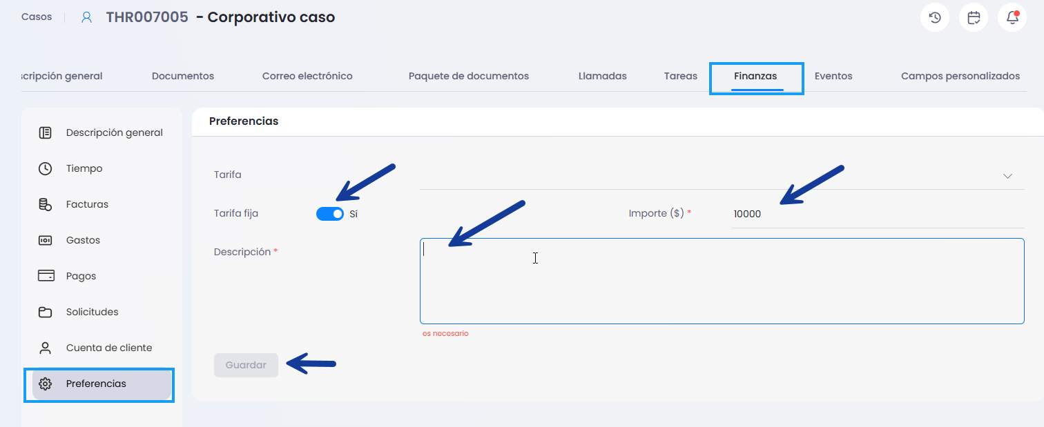Si ha seleccionado que su caso tenga una tarifa fija en la pestaña Finanzas – Configuración de un caso, puede emitir una factura sin agregar tiempo a un caso. Debe agregar la Descripción de la tarifa fija que se mostrará como el elemento incluido en la factura (opcional según su plantilla de factura; la descripción de la tarifa fija se mostrará cuando se use el código Registro de tiempo/Elemento/Descripción).