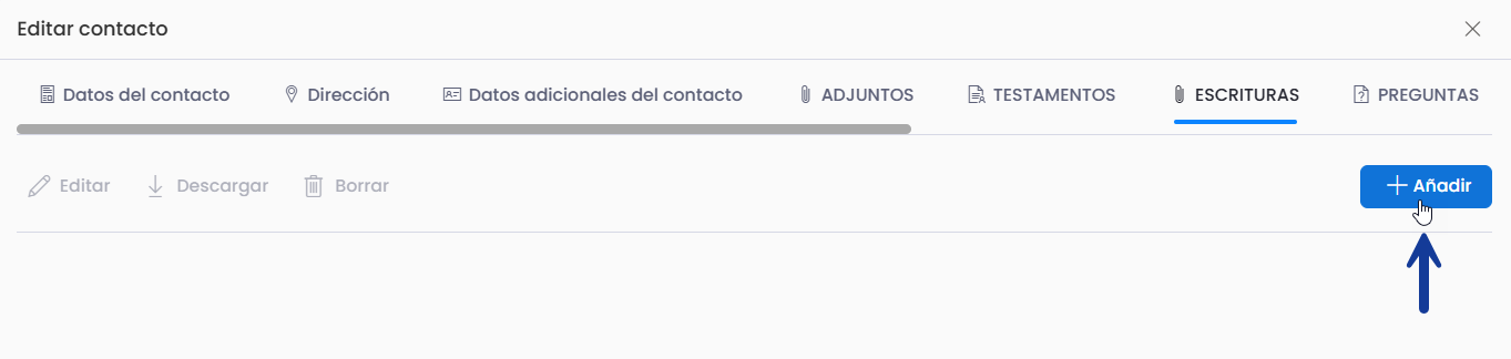 Las escrituras se deben agregar directamente a los detalles de un contacto en Thread, no se pueden agregar en la página Escrituras.
