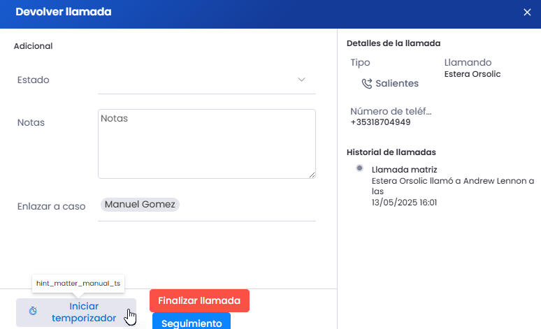 Realizar una devolución de llamada detiene el temporizador cuando haces clic en Finalizar llamada o Seguimiento.